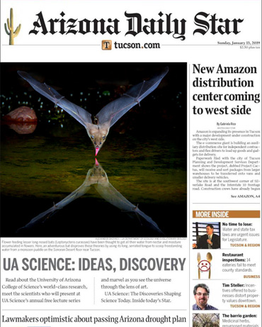 Our lesser long-nosed bat's "Crossing Theories" piece is the frontpage of Sunday's Arizona Daily Star — the state largest newspaper. This is our fifth (e.g., #4, #3) cover with the newspaper. The original photo is here.
