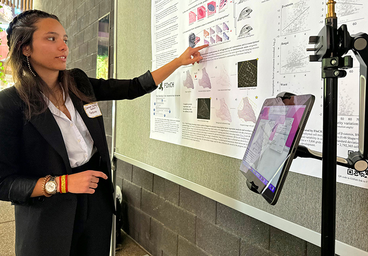 At the ceremony at University of Arizona Faculty Senate, Carmen Sánchez Moreno receives 2024 William S. Bickel Outstanding Undergraduate Original Research Award for her project "How do uniformly distributed cells give rise to organized structures in multicellular development?" and presented her approach to this major question at associated symposium in the College of Medicine.