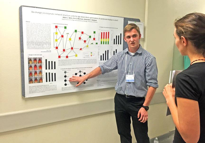 The Lab presents four posters at the 2017 EEB Undergraduate Research Symposium. Adam Welu presented a summary of this Honor Thesis (defended on 5 May 2017) on "The biochemical basis of within species color polymorphism". Jakob Abtahi talked about his current work: "Precise adaptation without loss of adaptive potential". Caitlin Davey discussed "Metabolic divergence of ecologically distinct taxa" analysing data from nearly 300 species, Xander Posner talked about the evolution of controllability in complex directed networks — the Lab's Next Big Project.