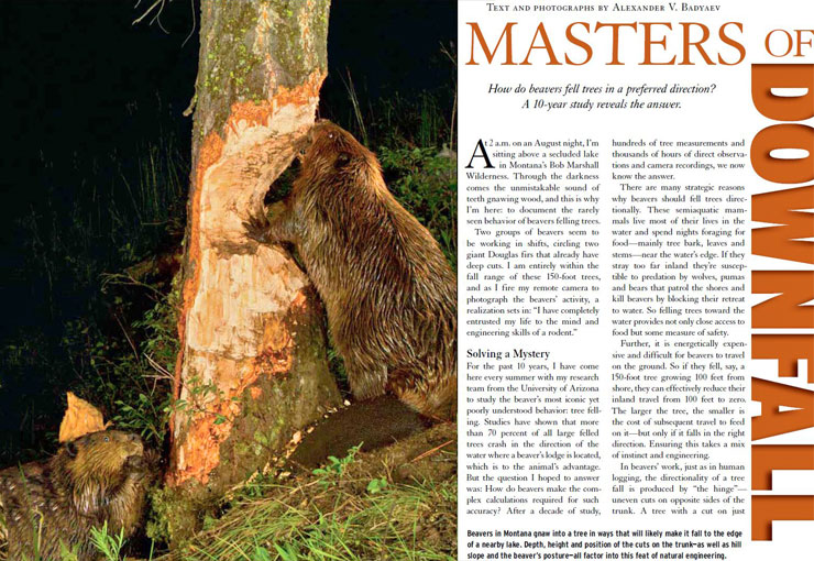 If you ever wondered how beavers fell giant trees directionally (in a crashing violation of The Central Place Foraging Theory), read a new cover feature in National Wildlife or see the photos for the first popular summary of this recently completed long-term project.