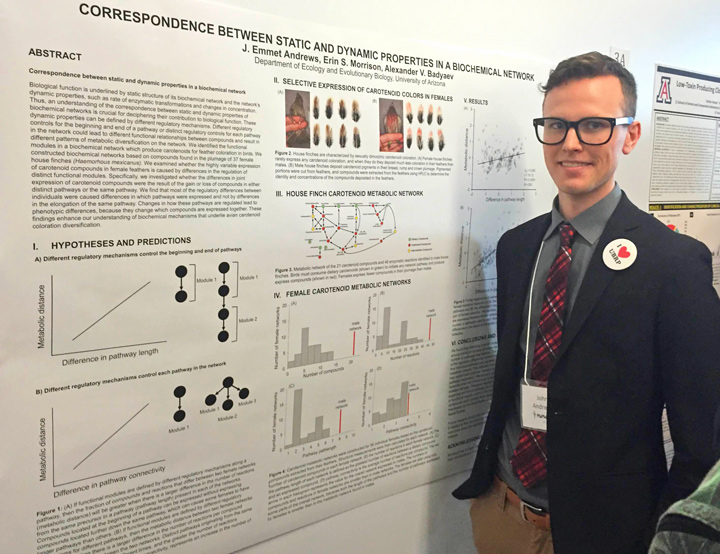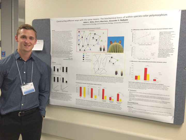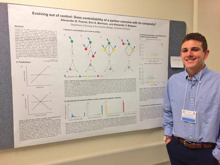 The Lab students presented 6 (!) comprehensive papers at the 2016 EEB Poster session. Caitlin Davey analyzed correspondence between ecological specialization and metabolic complexity across 250 species, Emmet Andrews talked about structural and dynamic subsampling of shared traits in sexual dimorphisms, Xander Posner presented the test of new approach for analysing coevolution of controllability and complexity, Sarah Davis discussed the origin of novel color phenotypes during population divergence, and Adam Welu presented in-depth analysis of the biochemical basis of within-species polymorphisms.