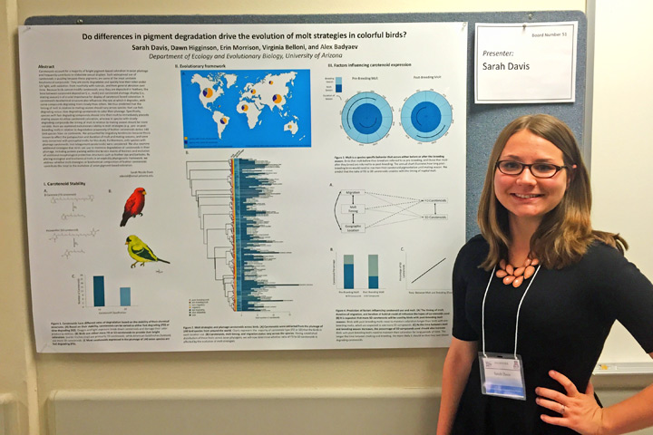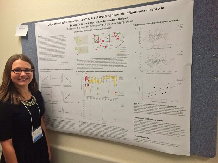 Sarah Davis receives the First Place Award (Emergent Category) for her poster at the 2015 EEB Undergraduate Research Session. The lab’s students presents three additional excellent posters at the event: Adam Welu with "Do changes in enzymatic network underlie age-dependent optimization of carotenoid displays in a bird?", Victoria Farrar with "Evolution of novel color phenotypes during population establishment: Genetic, biochemical, and ecological considerations", and Tayler LaSharr (last year's First Place Winner) with "Mechanisms influencing distribution and the coexistence of passerine species"