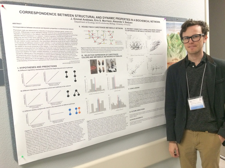 The Lab students presented 5 (!) comprehensive papers at the 2016 EEB Poster session. Caitlin Davey analyzed correspondence between ecological specialization and metabolic complexity across 250 species, Emmet Andrews talked about structural and dynamic subsampling of shared traits in sexual dimorphisms, Xander Posner presented the test of new approach for analysing coevolution of controllability and complexity, Sarah Davis discussed the origin of novel color phenotypes during population divergence, and Adam Welu presented in-depth analysis of the biochemical basis of within-species polymorphisms.